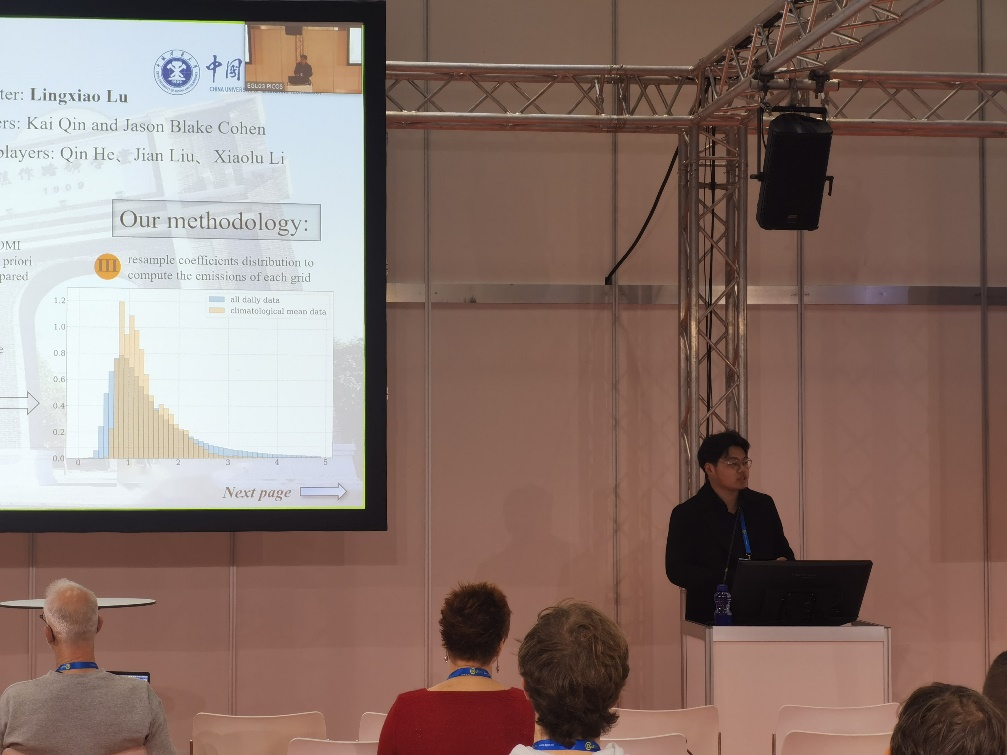 博士生陆凌霄在“Atmospheric composition variability and trends”专题作了题为“Computing Daily NOx Inversion over Energy Consuming and Urbanized Regions Using TROPOMI Data – A Novel Model Free Approach”的PICO报告;