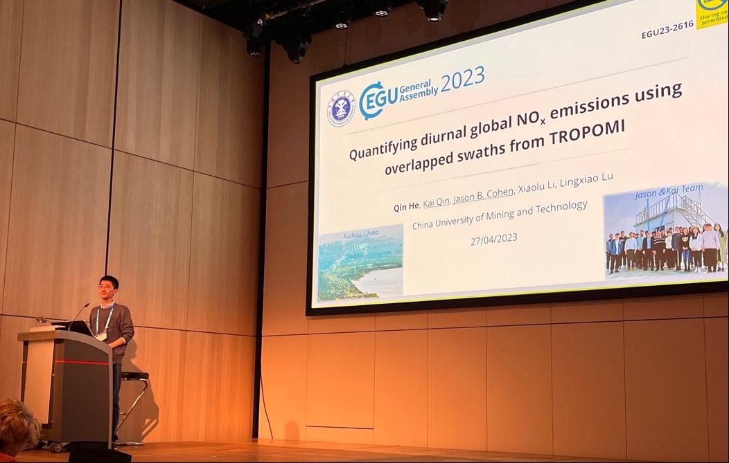 博士生何秦在“Satellite observations of tropospheric composition and pollution, analyses with models and applications”专题作了题为“Exploring the utility of global high-resolution NO2 columns from TROPOMI for investigating the diurnal variability and downscaling historical measurements”的口头报告;