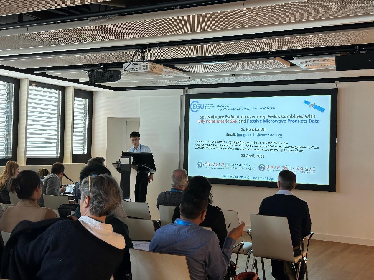 时洪涛讲师在“Remote Sensing of Soil Moistur”专题作了题为“Soil Moisture Estimation over Crop Fields Combined with Fully Polarimetric SAR and Passive Microwave Products Data”的口头报告;