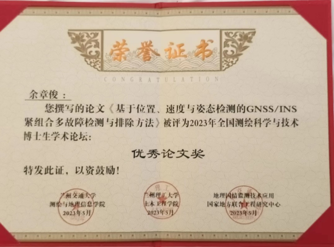 会议期间永利官网郑南山、汪云甲教授参加了国务院学科评议组召开的测绘学科工作会议,研讨了研究生人才培养及学科发展问题。会议上李增科教授和赵银娣副教授分别做了题为“城市复杂建筑环境下的无缝定位到PNT系统”和“基于轻量大核卷积与差分交叉注意力的遥感影像变化监测”的特邀报告,赵东升副教授和李冠青讲师分别做了题为“适用于多采样间隔测地型接收机数据的GNSS电离层闪烁因子提取方法”和“融合管节安装定位和贯通测量的特长沉管隧道线形测控新方法”的论坛报告,刘金香、余章俊、刘振彬、王腾、张念斌、刘虎、张磊昕、张珂威等研究生做了博士生论坛报告,由张书毕教授和张秋昭教授联合指导的余章俊博士所撰写的论文《基于位置、速度与姿态检测的GNSS/INS紧组合多故障检测与排除方法》获得本届论坛优秀论文奖。